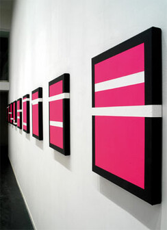 Er rekurriert auf das Medium des traditionellen Tafelbildes und hält hier eine bestimmte Ordnung ein, die keinen tieferen Sinn verfolgt als jenen, Gleichförmigkeit bei gleichzeitiger Abwandlung zu erreichen. Die 12 Bilder messen 60 x 50 cm, sind 4 cm tief und die pinkfarbenen, weißen und schwarzen Streifen sind jeweils 4 cm breit. Für diese Größe sind sie relativ kompakt, d.h. erhaben, sodass sie einen nahezu objekthaften, schachtelartigen Charakter annehmen. Damit wird von der Oberfläche abgelenkt und in die Tiefe gedacht, in ein Volumen hinein. Es ist ähnlich wie bei seinen Schriftbändern, z.B. SUP POP / PORN TECH: ein Dahinterliegendes, Subliminales kommt an die Oberfläche, sichtbar oder spürbar, aber dennoch verborgen. Die „penetrant“ auf Oberfläche verweisende Oberfläche wird doch körperhaft und viel-schichtig.