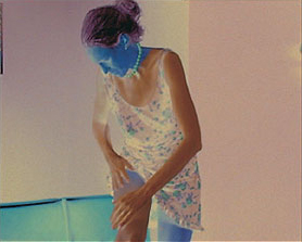 Das Video „Interludium“ ist ein Film mit digitaler Nachbearbeitung und bezieht seine konzeptuelle Pointe aus dem Dispositiv „positiv – negativ“, das Stieger hier metaphorisch einbringt, nämlich im Zusammenhang mit einem Verfahrensprinzip des Films selbst. Zu sehen ist der Ausschnitt eines Wohnzimmers mit einer jungen Frau, und zwar in der Negativversion eines Filmes, in der die Farben umgekehrt sind. Haut erscheint dann blau, Blau erscheint in Orangetönen und Schwarz als Weiß. Die Frau entdeckt einen hautfarbenen Fleck auf ihrem Dekolleté und beginnt diesen abzuwischen, was zur Folge hat, dass sich scheinbar unerklärlich die Farbe des Flecks über alle Hautflächen ausbreitet und die Frau schließlich insgesamt eine „positive“ Hautfarbe aufweist. Diesen Effekt erzielt Stieger dadurch, dass sie ebenfalls einen Umkehrvorgang macht, indem sie real nicht etwas entfernt, sondern sukzessive auf alle freien Hautstellen etwas aufträgt – blaue Farbe, die eben im Negativ hautfarben wirkt.