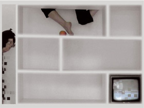 "Es ist nicht übertrieben zu behaupten, dass die klassische Kultur von Tlön eine einzige Disziplin umfasst: die Psychologie. Die anderen sind ihr untergeordnet. Ich habe gesagt, dass die Menschen dieses Planeten die Welt als eine Folge geistiger Vorgänge auffassen, die sich nicht im Raum, sondern nacheinander in der Zeit abspielen. (...) Die Geometrie umfasst in Tlön zwei voneinander abweichende Disziplinen: die Seh- und die Tastgeometrie. Die letztere entspricht der uns geläufigen, wird aber der ersten untergeordnet. (...) In Tlön verdoppeln sich die Dinge; sie neigen ebenfalls dazu, undeutlich zu werden und die Einzelheiten einzubüßen, wenn die Leute sie vergessen. (...) Tlön mag ein Labyrinth sein, doch ist es ein von Menschen entworfenes Labyrinth, ein Labyrinth, dessen Entzifferung der Menschheit aufgegeben ist." (2) Manuela Marks "Tlön", 2003, DVD, ist ein Regal, das zum Kosmos wird. Im engen schwarzen Cat-Suit mit Kapuze versucht eine Person das Regal/den Kosmos zu erfahren und zu begreifen. Fast tänzerisch anmutend schmiegt sie sich an die Seitenwände und passt sich in die Module ein. Die Darstellung psychischer Befindlichkeit und die Selbstbetrachtung im gespiegelten Ich, die Verortung im (Regal-)System, das Ausloten von Seh- und Tastgeometrie und somit auch das Ausloten der Beziehung von Darstellerin, ihrer Spiegelung/Verdoppelung und den Betrachterinnen und Betrachtern sind Inhalt des Videos. Die Zeichen dieser Arbeit zu dechiffrieren gelingt vielleicht am besten auf einer vorsprachlichen Ebene: nonverbal, emotional.