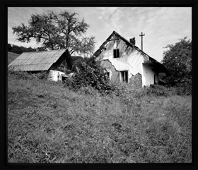 Wie aus Zeit und Raum gerutscht, harrt ein kleines, unauffälliges Bauernhaus alt und baufällig einer ungewissen Zukunft. Sein Standort im slowenischen Serdica, im österreichisch-slowenischen Grenzgebiet, dem heutigen Naturpark Raab, signalisiert ein nicht unbedeutendes politisch-kulturelles Spannungsfeld. Dergestalt begegnet uns das Gebäude auf einer großformatigen schwarzweißen Fotografie, ergänzt um eine zweite, die einen langgestreckten skulpturalen Block zeigt, bestehend aus fein säuberlich geordneten Bestandteilen eben jenes Hauses.
